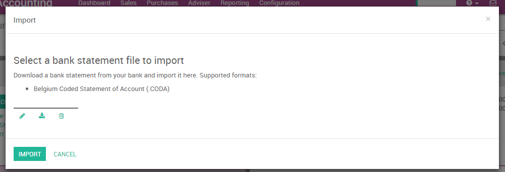 Con Odoo, puede descargar un archivo CODA desde su banco o software de contabilidad e importarlo directamente en Odoo. Esto creará todos los estados de cuenta bancaria.