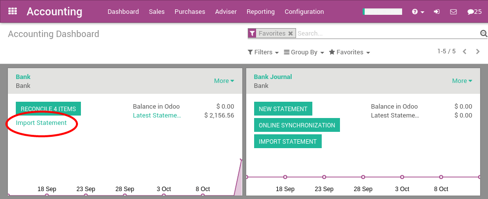 Después de haber importado el primer archivo, el tablero de instrumentos de contabilidad de Odoo propondrá automáticamente importar más archivos de su banco. Para la próxima importación, no es necesario acceder en el botón de Más, ya que se puede hacer clic directamente en el enlace Importar Declaración.