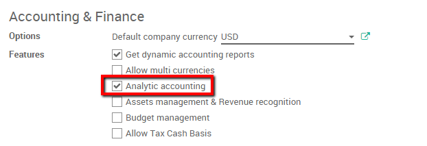 El siguiente paso es activar la contabilidad analítica. En la aplicación de contabilidad, seleccione y de clic en la casilla Contabilidad analítica.