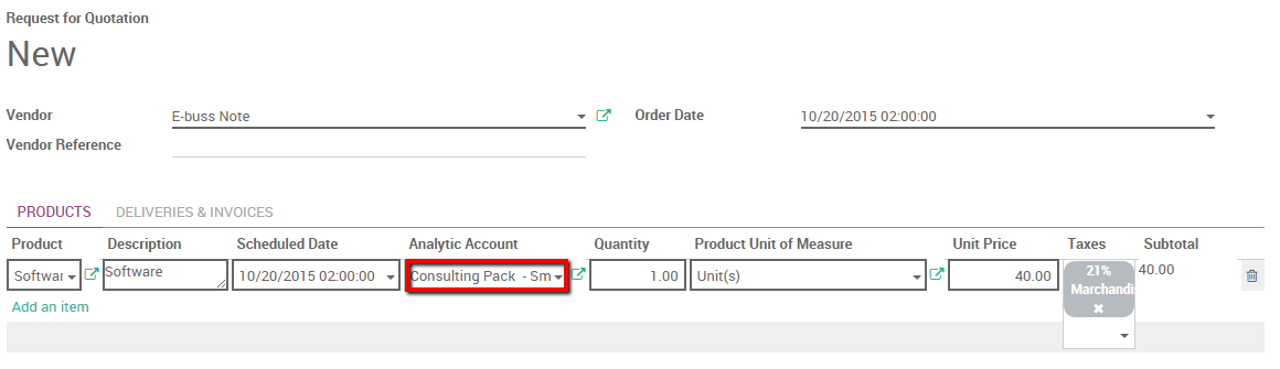 El módulo de compra puede ser usado de la forma vista anteriormente para manejar subcontratación. Si compramos un servicio de otra compañía podemos re-facturar este costo vinculando la línea de la orden de compra a la cuenta analítica correcta. Simplemente necesitamos crear el producto correcto del proveedor.