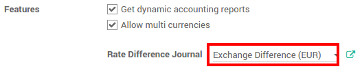 El Diario de Tipo de Cambio registra las diferencias entre el registro del pago y el monto esperado. Por ejemplo, si un pago es pagado 1 mes después que la factura fue emitida, el tipo de cambio probablemente ha cambiado. La fluctuación implica algunas pérdidas o ingresos que son registrados por Odoo.