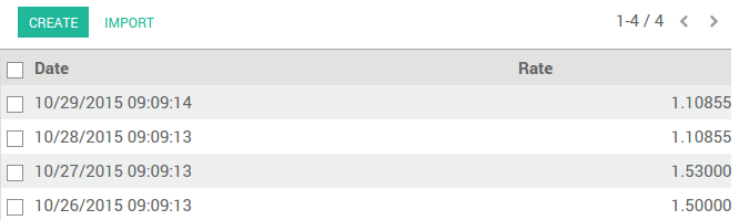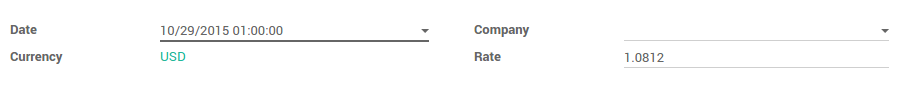 Puede manualmente configurar las tasas monetarias en: . Abra las monedas que quiere usar en Odoo y editelas. Asegúrese que la moneda esta activa.