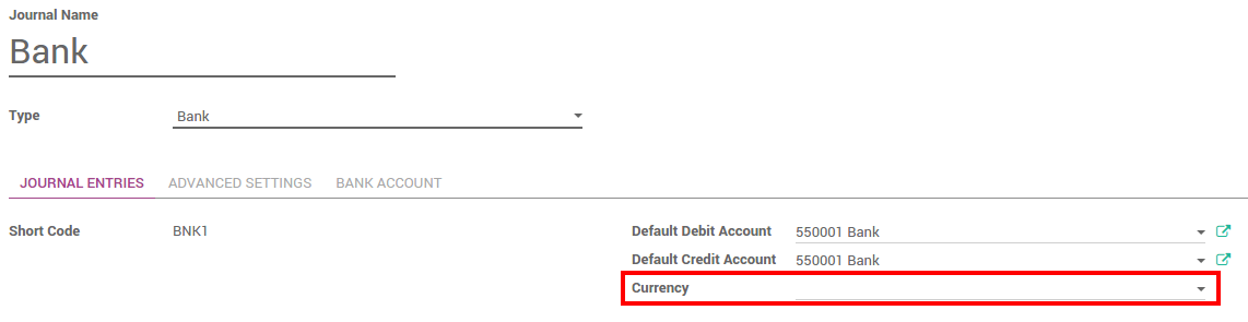 Para registrar pagos en otras monedas, debe remover la restricción de la moneda en el diario. Vaya a la aplicación contabilidad, De clic en Más en el diario y Ajustes.