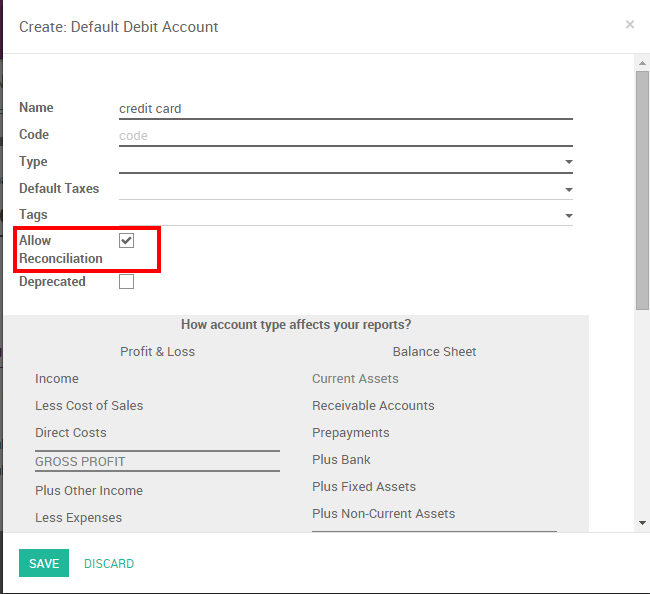 El tipo de cuenta debe ser "Tarjeta de crédito". Una vez hecho esto, no olvides establecer la cuenta de "Tarjetas de crédito" como "Permitir reconciliación".