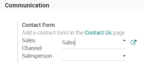 To change to a specific sales channel, go to under Communication you will find the Contact Form info and where to change the Sales Channel or Salesperson.