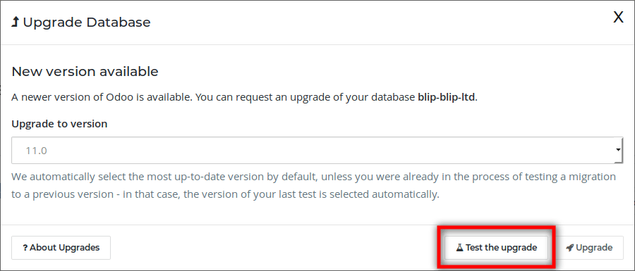 By clicking on the "Test upgrade" button an upgrade request will be generated. If our automated system does not encounter any problem, you will receive a "Test" version of your upgraded database.