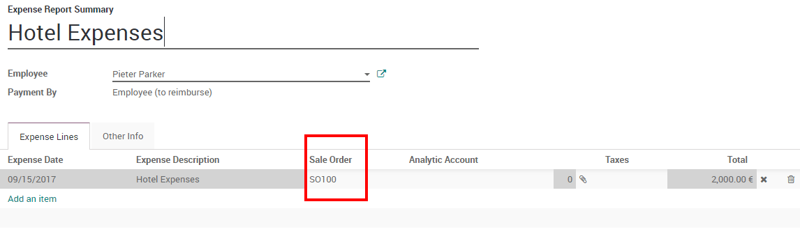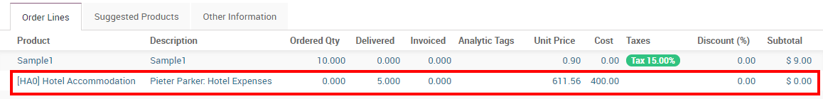 - As a salesman, create and confirm a Sales Order for the services delivered to your customer. If you don't put any expense in the order, it will be added automatically once posted by the accountant.