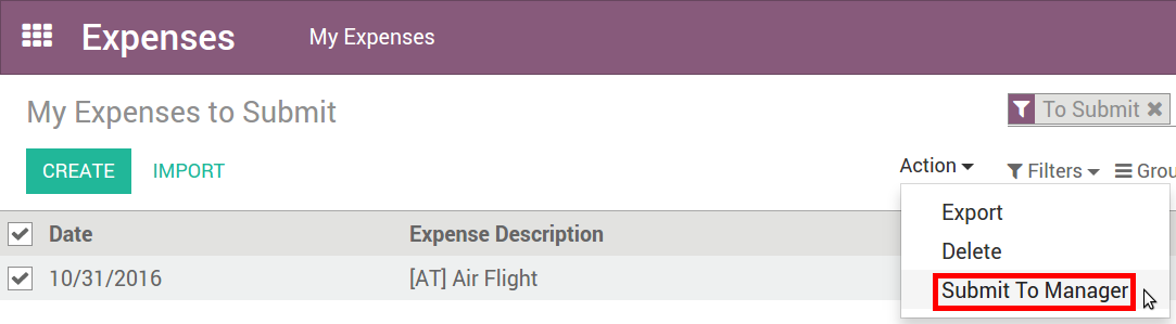 You can also submit expenses one by one from the Submit to Manager button on the form view of an expense.
