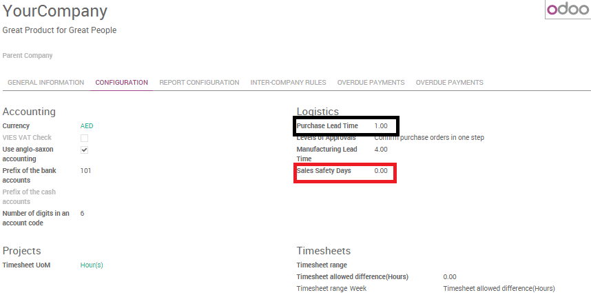 El tiempo de ventaja del cliente es el tiempo necesario para obtener su producto desde la tienda / bodega a su cliente. Puede ser configurado para cualquier producto. Simplemente seleccione un producto, vaya a la pestaña de ventas e indique su Tiempo de ventaja de cliente.