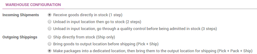 Unos pocos pasos de configuración son necesarios para ejecutar Selección + Empaque + Envío en Odoo. Estos pasos crear algunas ubicaciones adicionales, las cuales por defecto son llamadas Salida y Zona de Empaque. Entonces, si el código de su bodega es WH, esta configuración creará una ubicación llamada WH/Salida y otra llamada WH/Zona de Empaque.