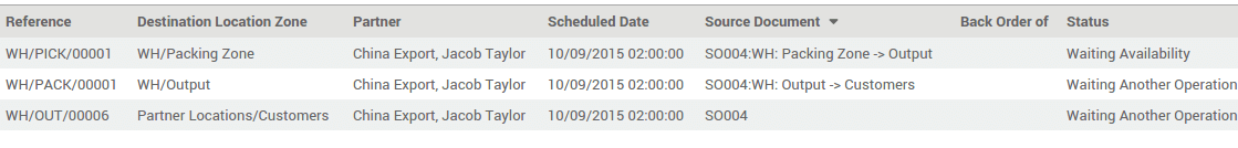 Los bienes se moverán desde WH/Existencias a WH/Zona de Empaque en el primer paso. Luego se moverán desde WH/Zona de Empaque a WH/Salida. Luego, finalmente, será entregado desde WH/Salida a su destino final.