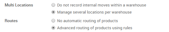 Bajo , active el botón de radio Ruteo Avanzado de productos usando reglas. Asegúrese que la opción Administrar varias ubicaciones por bodega esta activada también.