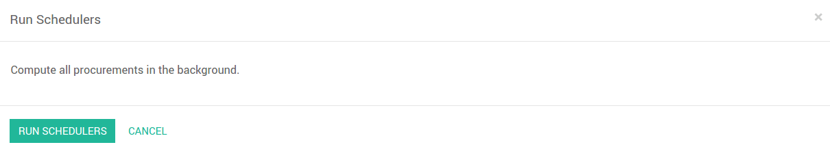 El programador es el motor de cálculo el cual planea y prioriza la producción y adquisiciones automáticamente de acuerdo a las reglas definidas en los productos. Por defecto, el organizador esta configurado para ejecutarse una vez al día (Odoo automáticamente crea una Acción Programada para esto).