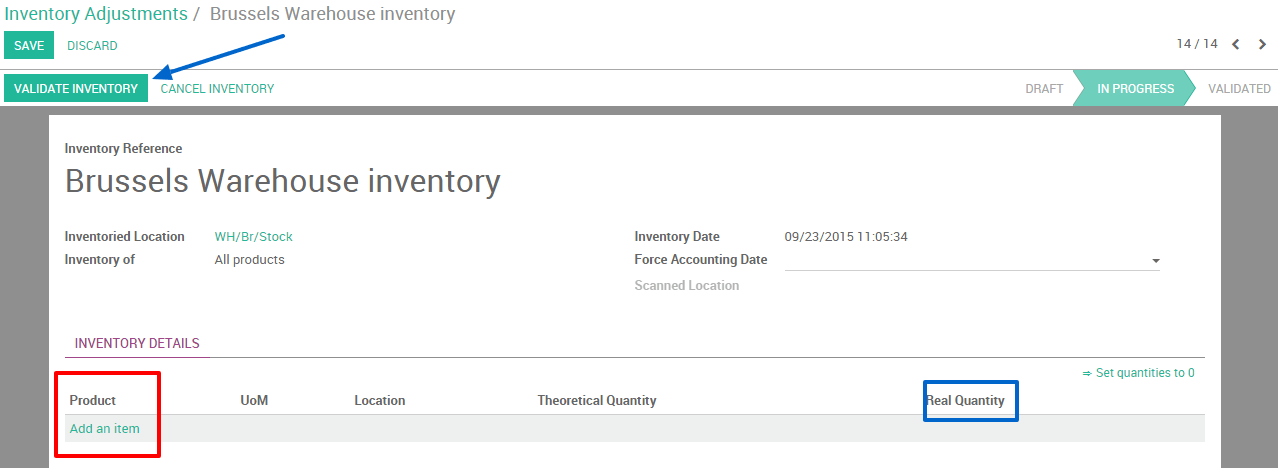 Vaya a la aplicación de inventario, seleccione . Luego puede crear un nuevo inventario dando clic en Crear. Llene la Referencia de Inventario, Fecha y asegúrese de seleccionar la bodega y ubicación correctas.