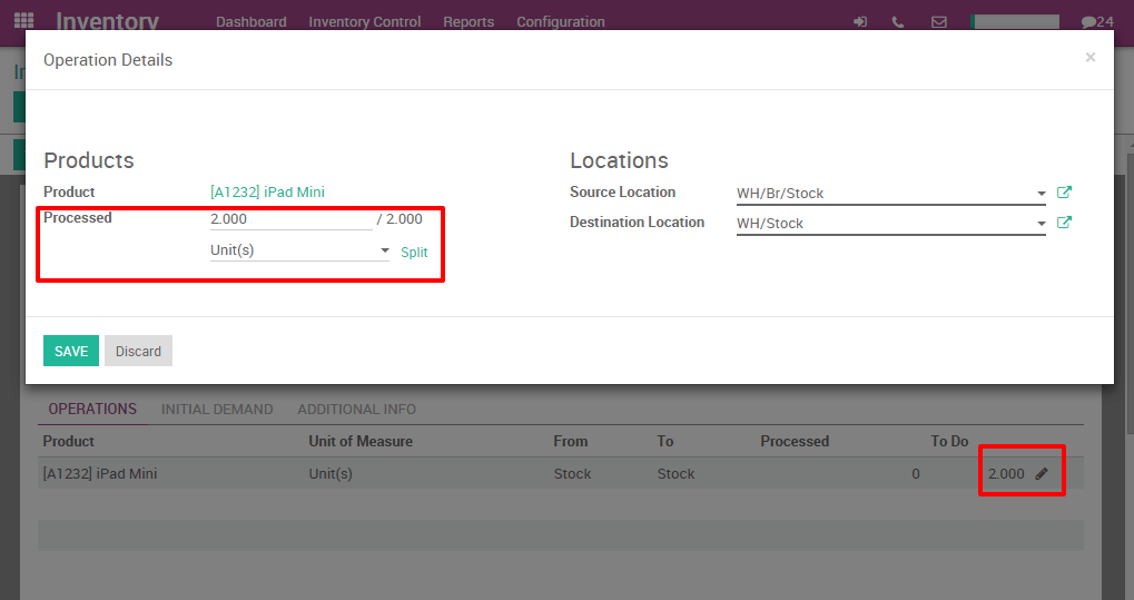 Si selecciona Validar, Odoo procesará todas las cantidades a transferir.