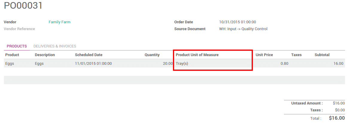 Los huevos son vendidos por docena. Puede elegir la unidad de medida en el documento órden de venta. Cuando lo haga, el precio es calculado automáticamente desde la unidad o la docena.