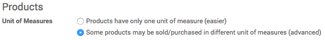 En la aplicación de Inventario, vaya a . En la sección de Productos, seleccione Algunos productos pueden ser vendidos/comprados en diferentes unidades de medida (avanzado), luego de clic en Aplicar.