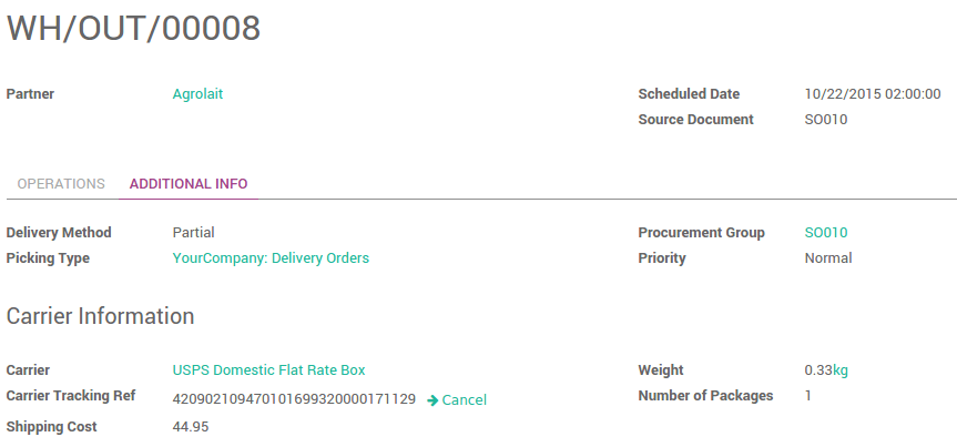 Para facturar el precio del cargo de entrega en la órden de venta, de clic en Precio configurado, esto agregará una línea con el nombre del método de entrega como un producto. Puede variar del precio real.