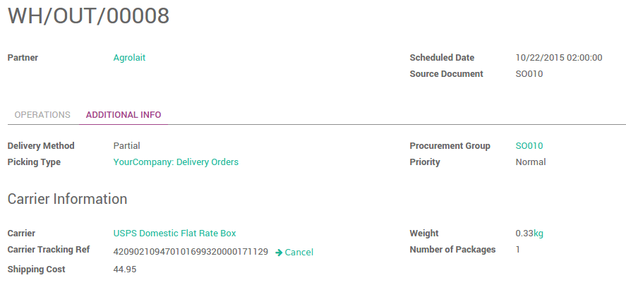 La órden de entrega creada desde la órden de venta tomará la información de envío desde allí, pero puede cambiar el transportador si lo desea.