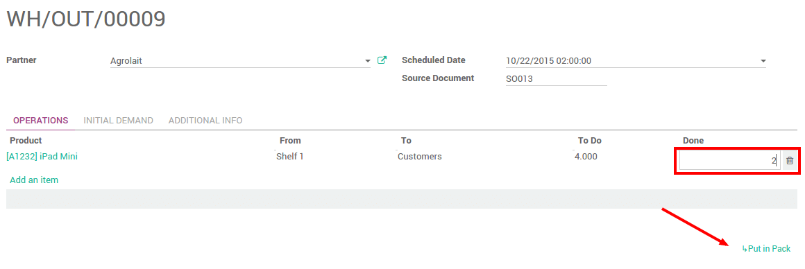 Elija la cantidad que desea poner en el primer paquete en la columna Realizado, luego de clic en el vinculo Ponerlo en Paquete.