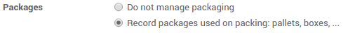 Para configurar el uso de paquetes, vaya al menú . Localice la sección Paquetes y marque Registrar paquetes usados en empaque: pallets, cajas,...