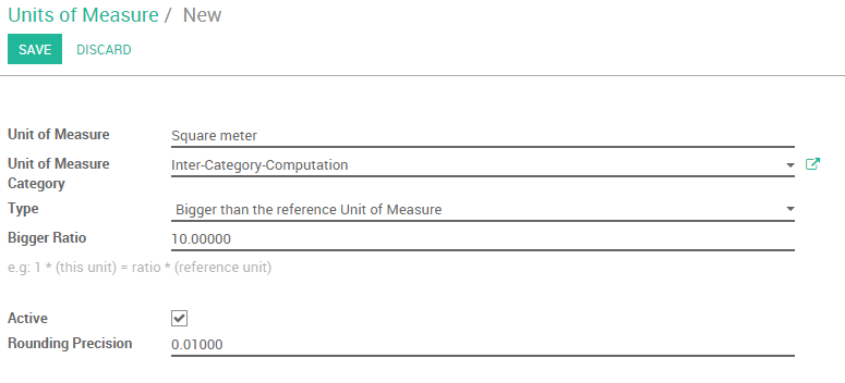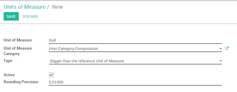 La unidad Rollo es parte de la categoría Inter-Categoría-Computación y es un Tipo de Referencia de Unidades (ver la siguiente imagen). El tipo de Referencias de Unidades se establece la medida como una referencia dentro de la categoría. Significa que otras medidas serán convertidas dependiendo de esta medida (por ejemplo: 1 rollo = 10 metros cuadrados, 2 rollos = 20 metros cuadrados, etc.).
