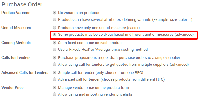 En un negocio de día por día, puede suceder que su proveedor utilice una unidad de medida diferente de como se registra en las ventas. Esto puede causar confusión representativa dentro de las ventas y las compras e incluso hace perder mucho tiempo en las medidas de conversión. Por suerte en Odoo, puede manejar diferentes unidades de medidas dentro de las ventas y las compras muy fácilmente.