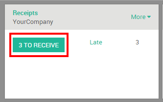 Si ha adquirido bienes físicos (almacenables o productos consumibles), puede recibir los productos del módulo de Inventario. Desde el tablero de Inventario, debería ver un botón X para Recibir, en el cuadro de la recepción de la bodega correspondiente.