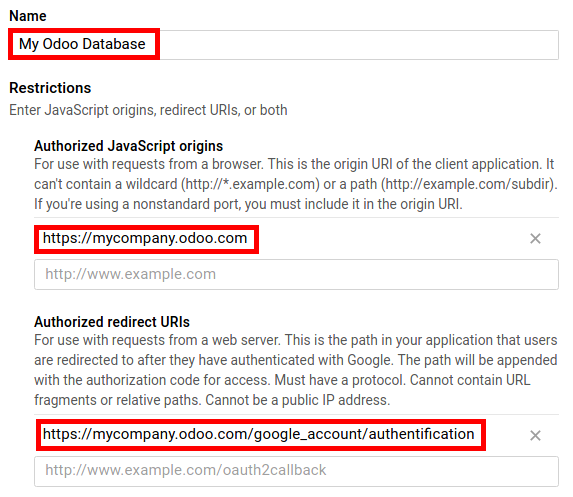 A continuación puedes crear una ID de cliente. Introduce el nombre de la aplicación (p.e. Odoo) y las páginas permitidas a las que te redirigirá. El origen autorizado de JavaScript es la URL de tu instancia de Odoo. La URI de redirección autorizada es la URL de tu instancia de Odoo seguida de '/google_account/authentication'.